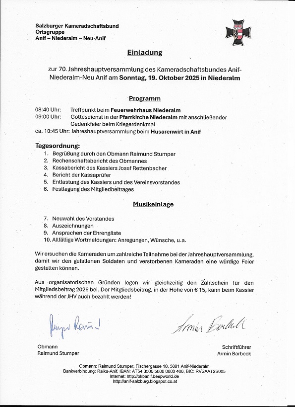 Unser Dank ergeht an die Abordnungen der Feuerwehr, der Fahnenabordnung der K ameradschaft Grödig, den historischen Schützenzug und ganz besonders der TMK-Anif für die musikalische Betreuung der Messe und der nachfolgenden Jahreshauptversammlung !!
